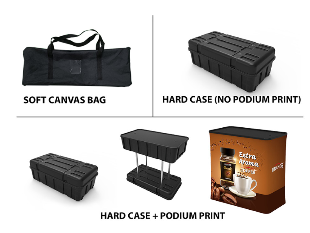 - Set includes curved backwall, podium, standing table, ipad stand and more