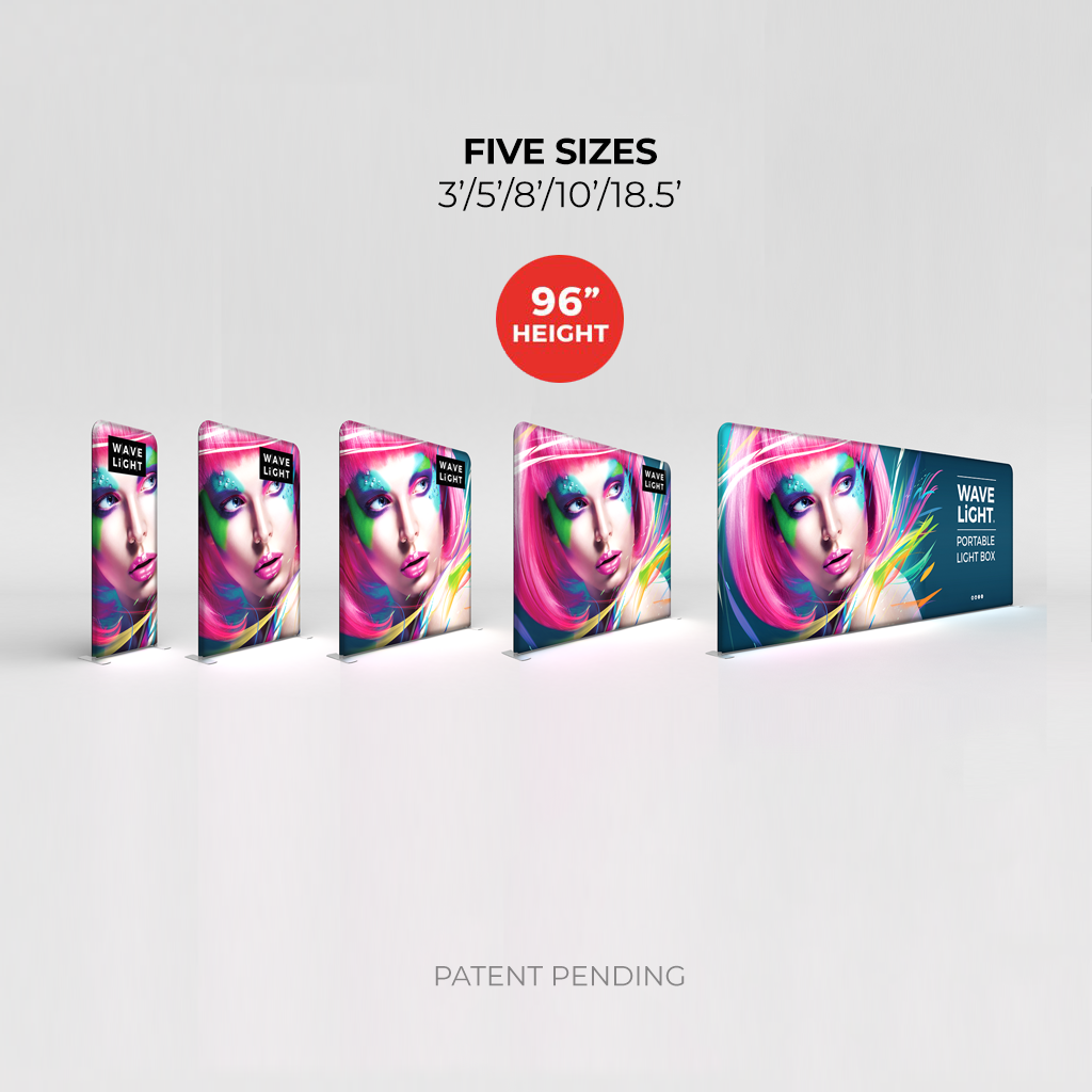 The WaveLight® Backlit Display is available in 5 sizes – 3ft (36”w x 96”h), 5ft (62”w x 96”h), 7.5ft (88’w x x96”h), 10ft (114”w x 96”h) and 18.5ft (218”w x  96’h).